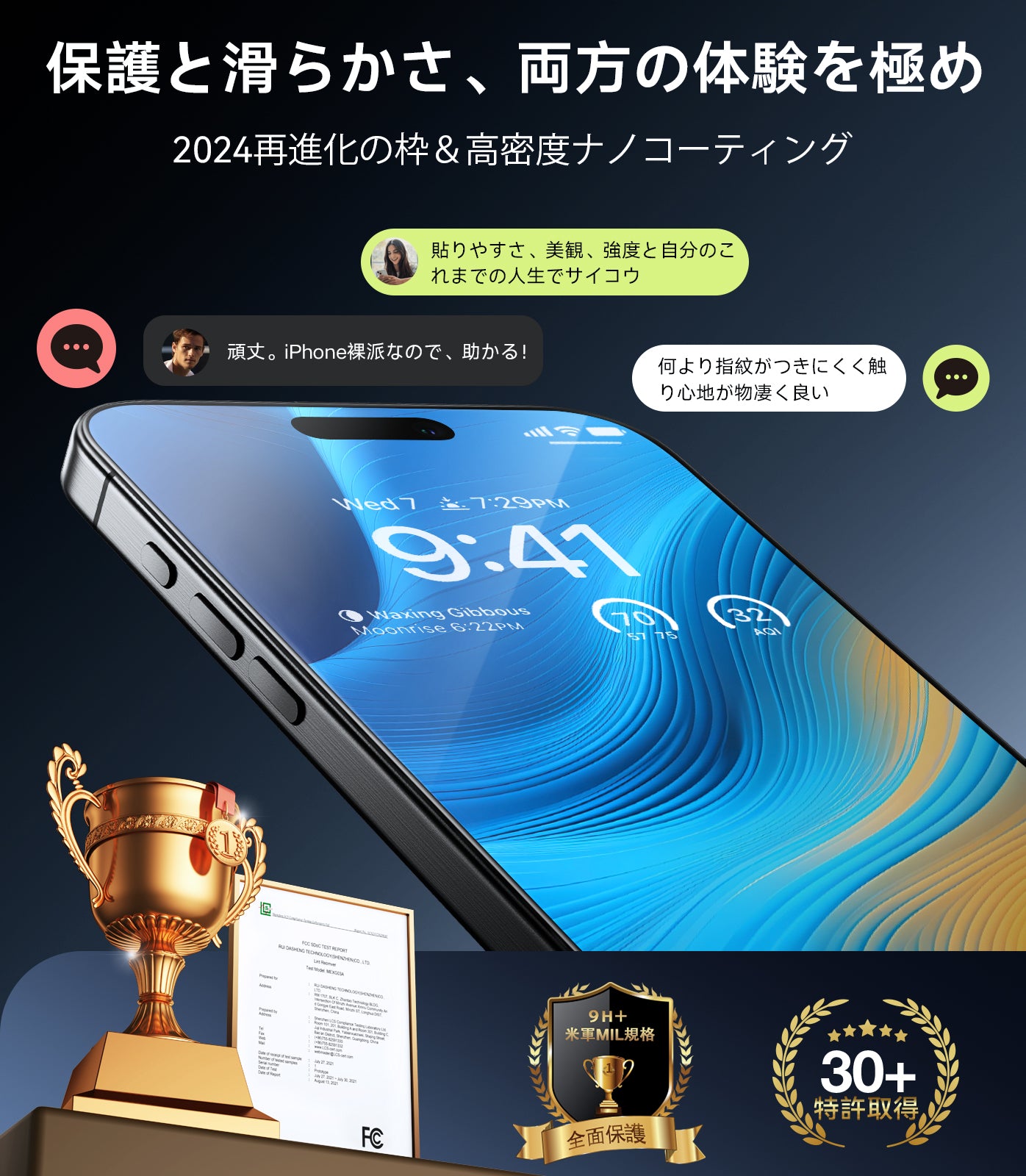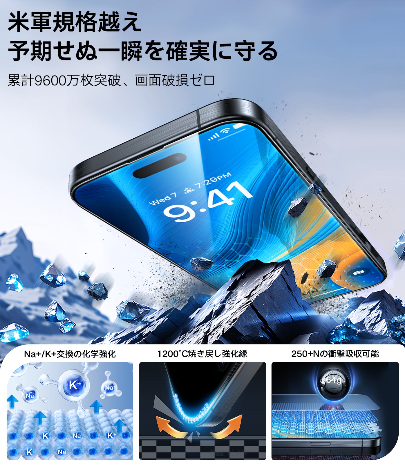 - 特長: 表面硬度9H、指紋防止、高感度タッチ、耐衝撃、傷防止