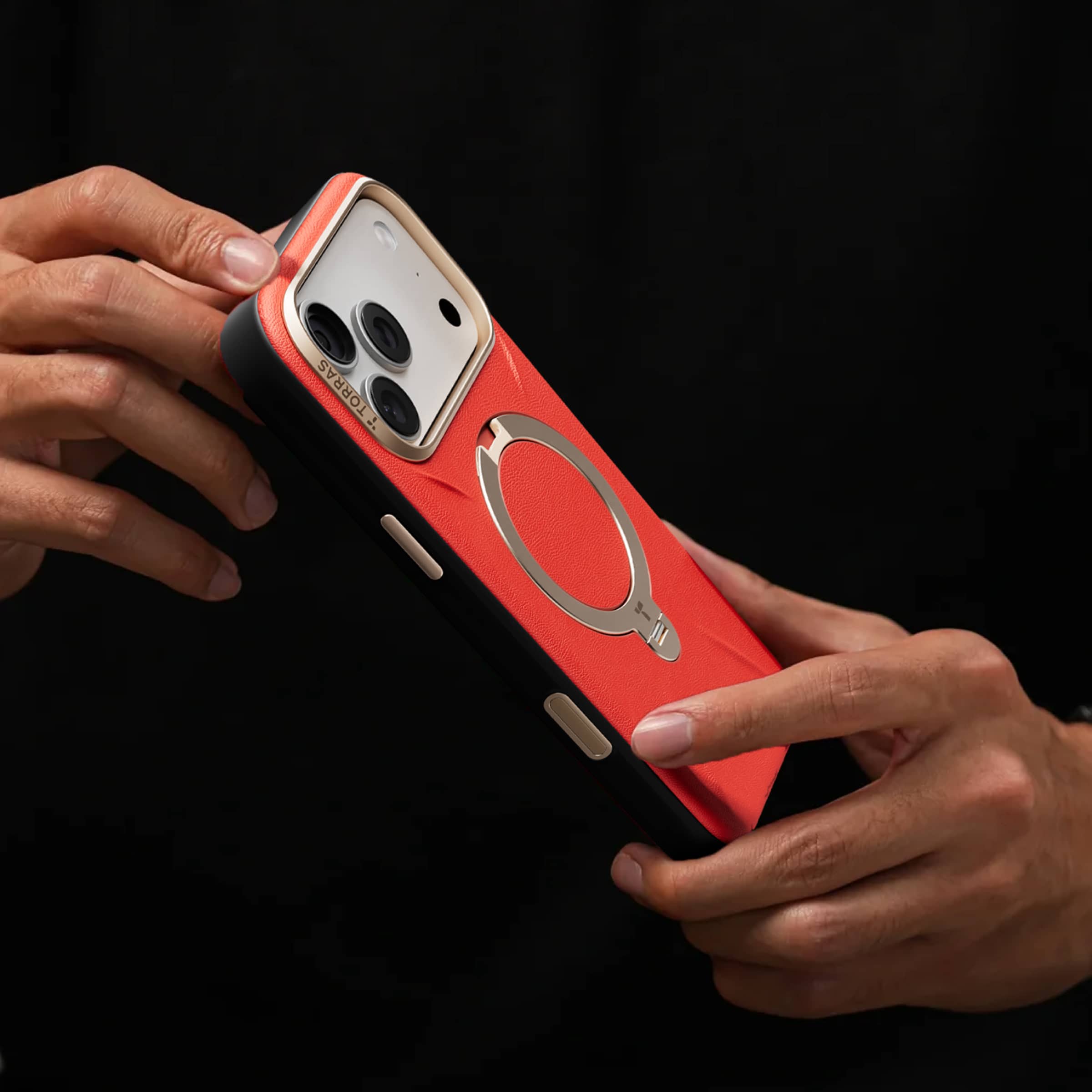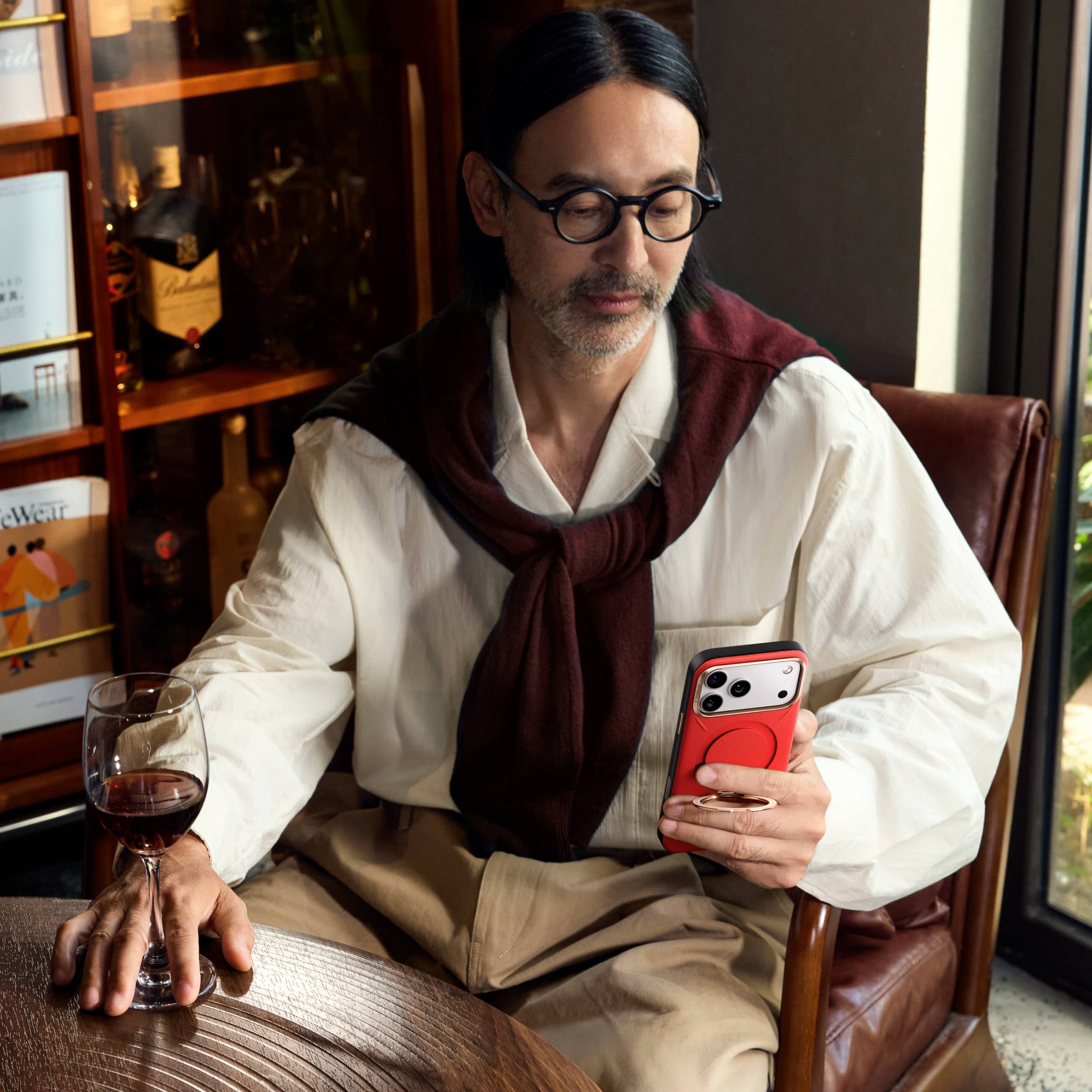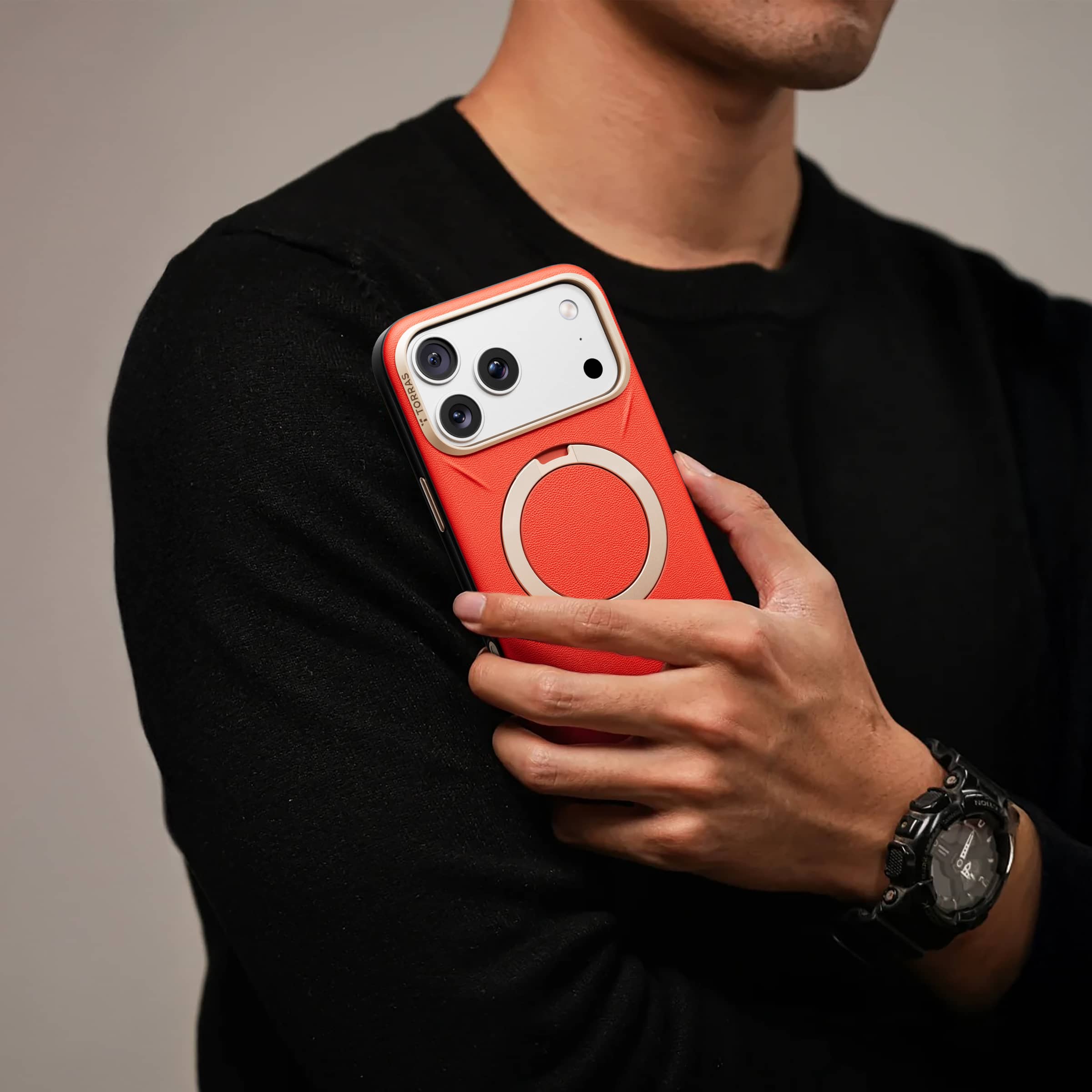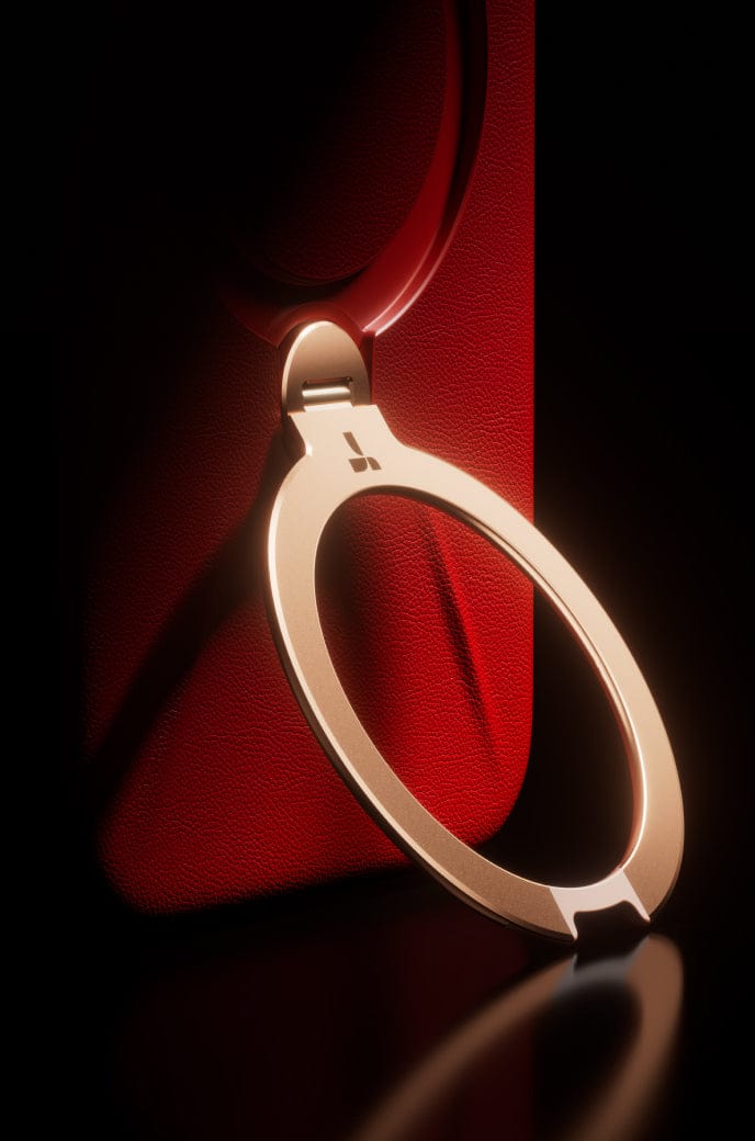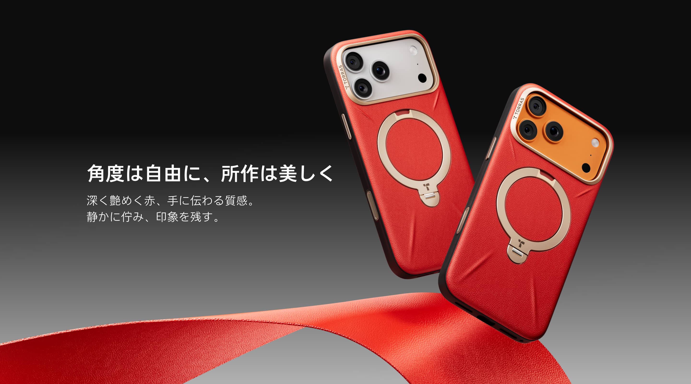 - 光沢アルミボタンと皮革風シリコンレザーで高級感を実現。
