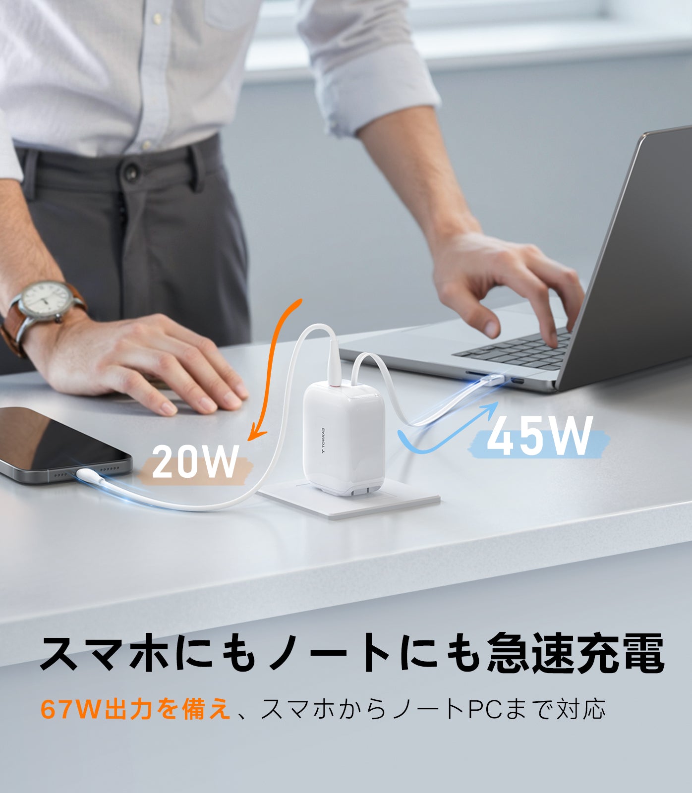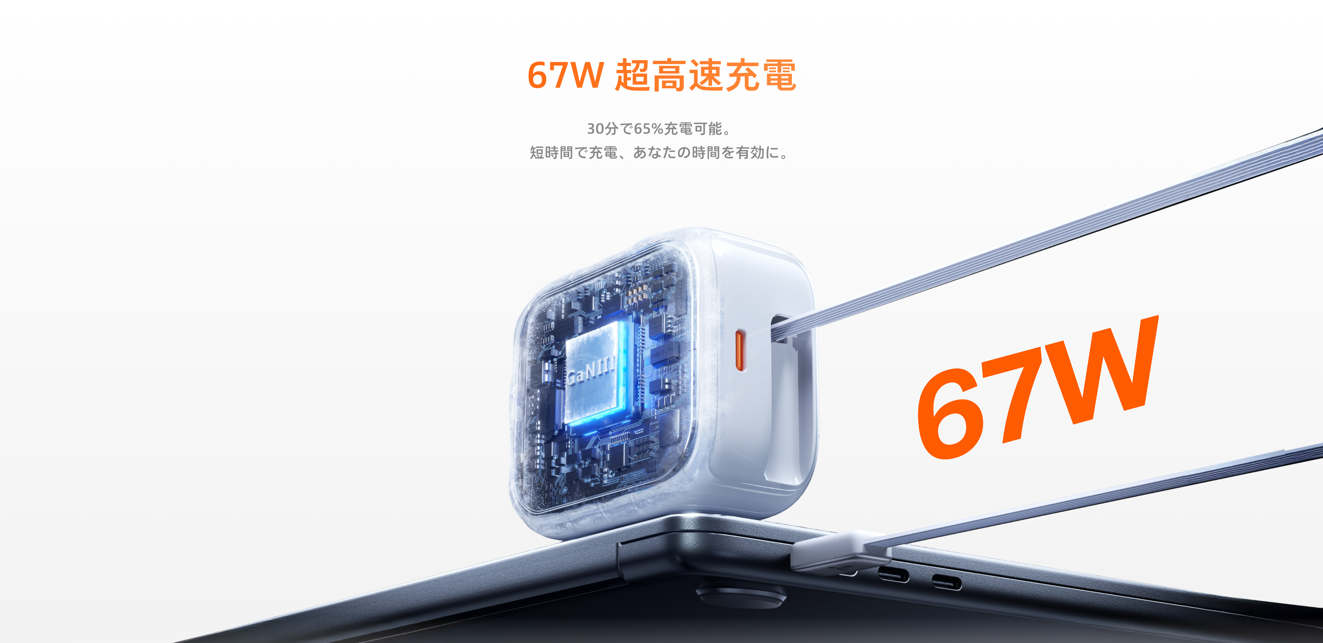- 67W High Output Power for Multiple Devices: Single port output of up to 67W, supports mainstream standards such as PD3.1. Charges a MacBook Pro to 50% in 50 minutes, and supports fast charging of smartphones and PCs with a single device.