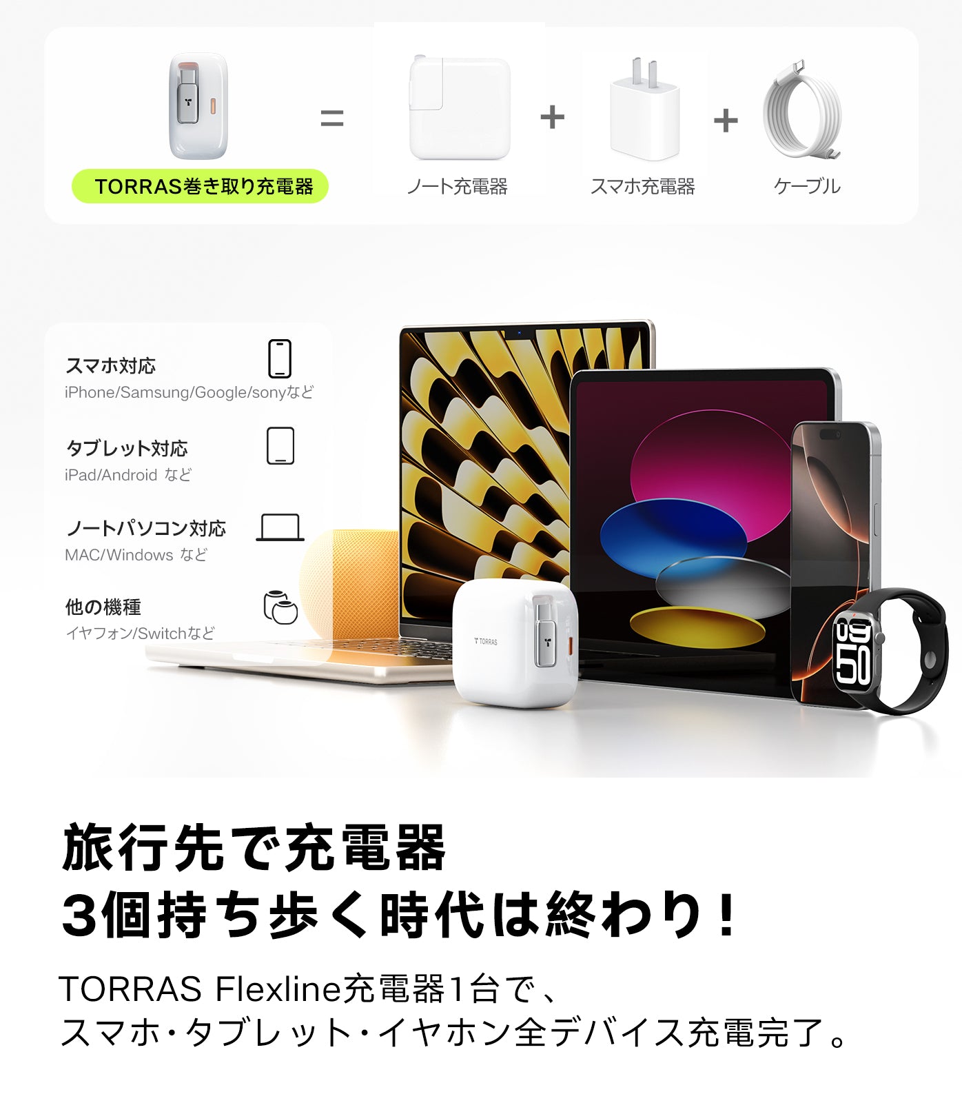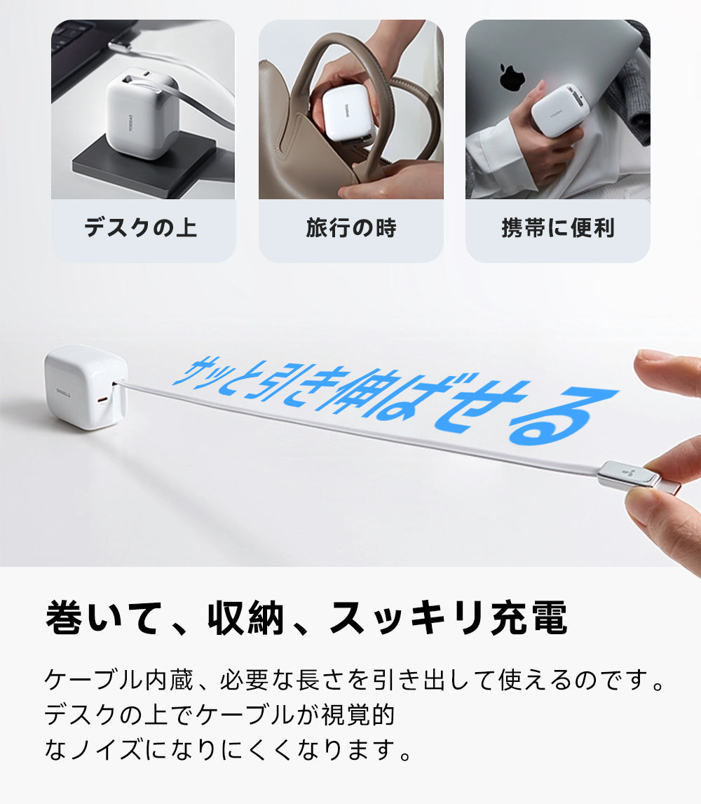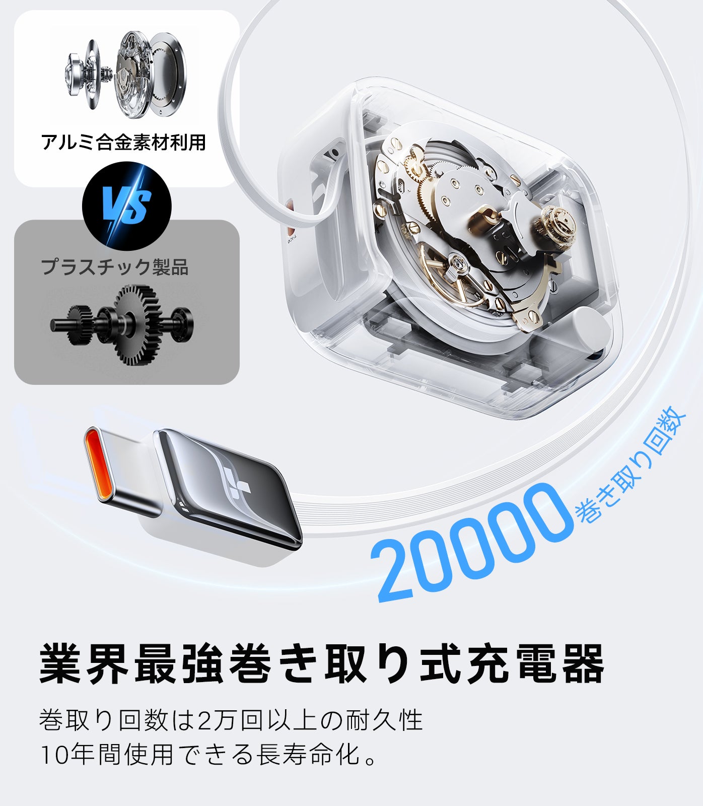 - 本体付属ケーブルの巻き取り式設計で、長さを自由に調節可能