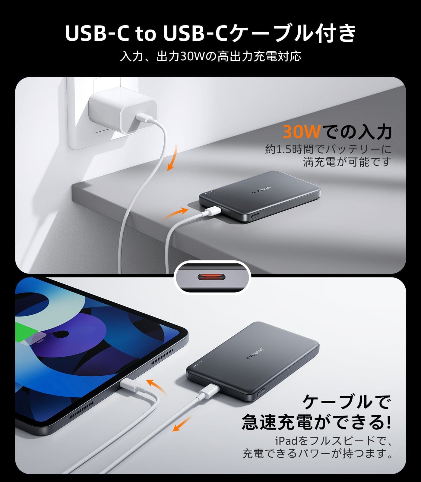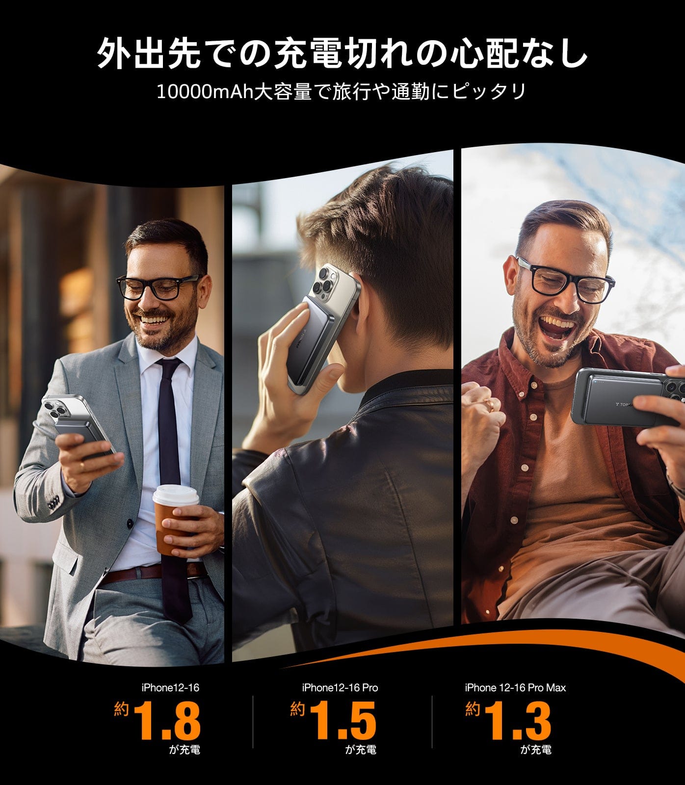 - スマホを約2回充電可能:10000mAhの大容量でスマホ約2回充電可能。ケーブルを使用しないため、充電中でも快適にスマホを操作できます。USB-Cポートは最大30W出力に対応。お使いのスマホに急速充電が可能です。