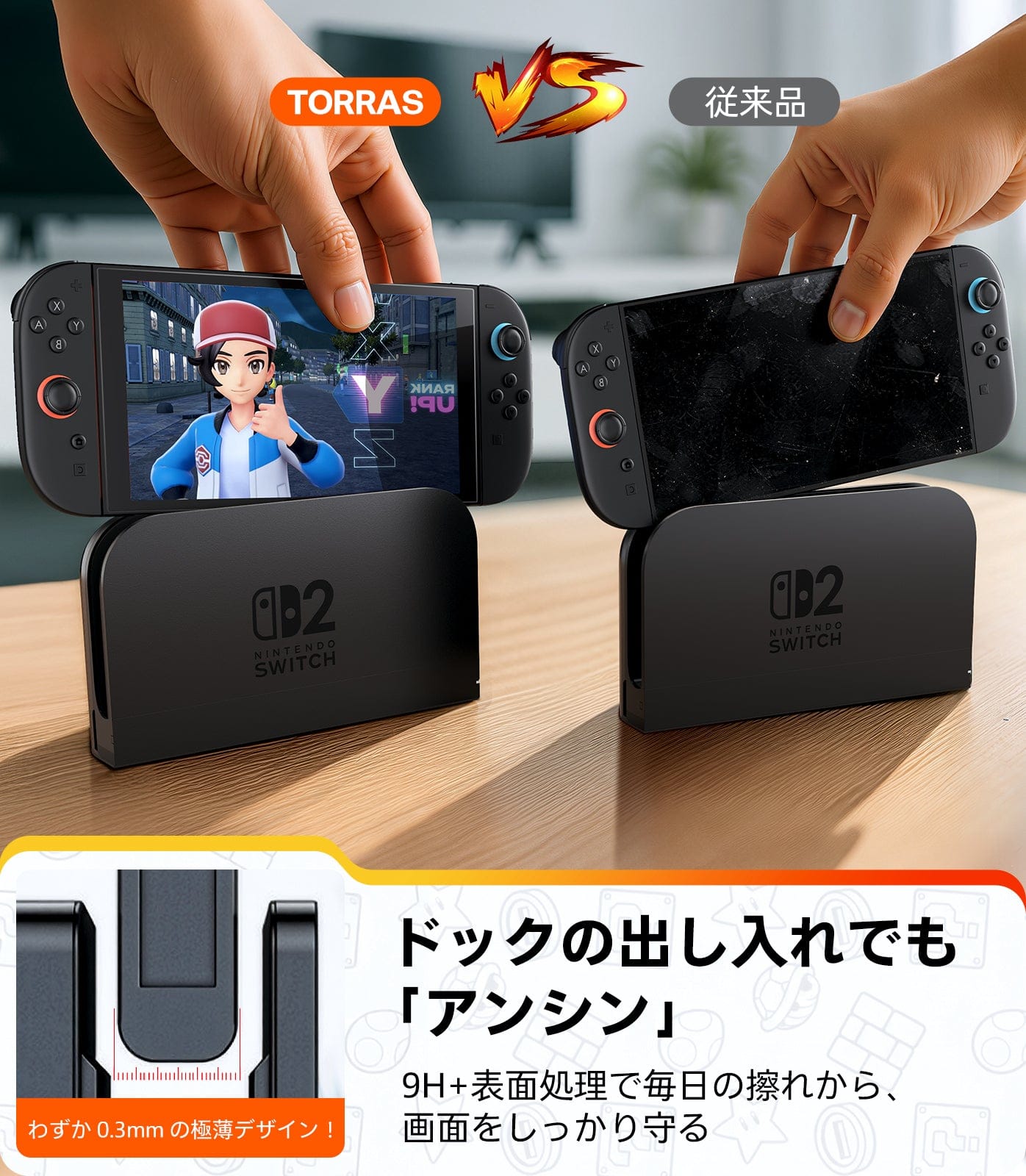 - 【TORRAS の “家庭向け” 耐久設計】リビング・持ち運び・ドック使用まで想定した強化ガラス。世界中でスマートデバイス用保護アクセサリーを展開する TORRAS が、Switch 2 の使用シーンに至適化。航空宇宙技術(AGC「Dragontrail Pro」)により9H+Hv673の世界トップ硬度を実現。釘・鍵の傷や231cm落下(市販品比5倍耐性) からスイッチ2 の画面を防護。世界累計9,600万枚販売、画面破損報告0件※(※自社調べ) の実績に基づき、ドック着脱時の擦れ、バッグ内での接触、家庭内でのうっかり落下までしっかり防護。お子様や家族で共有する環境でも、あんしんしてお使いいただけます。