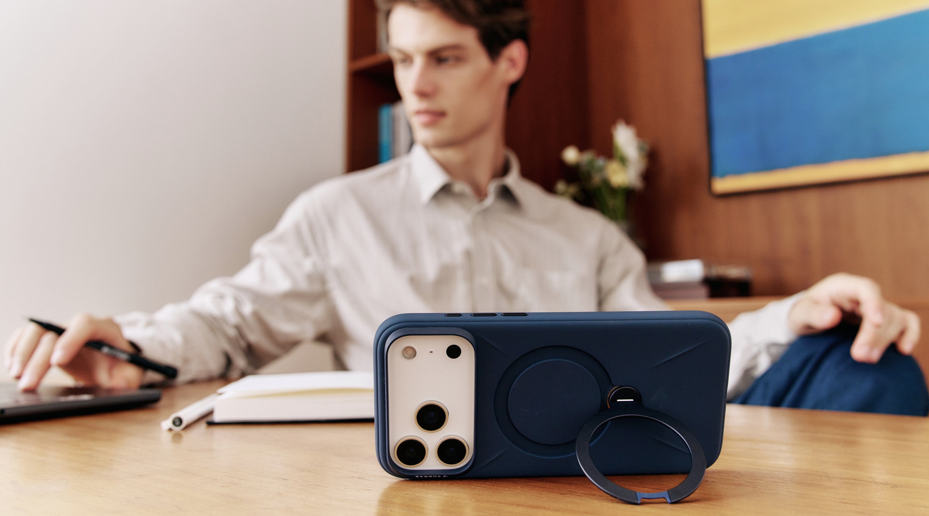 スタンド内蔵の強力マグネットが、MagSafeアクセサリーとの親和性を高めます。モバイルバッテリーも、しっかりと固定。
