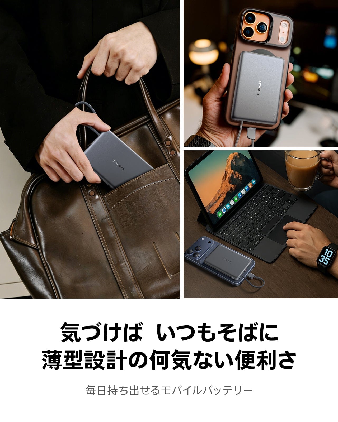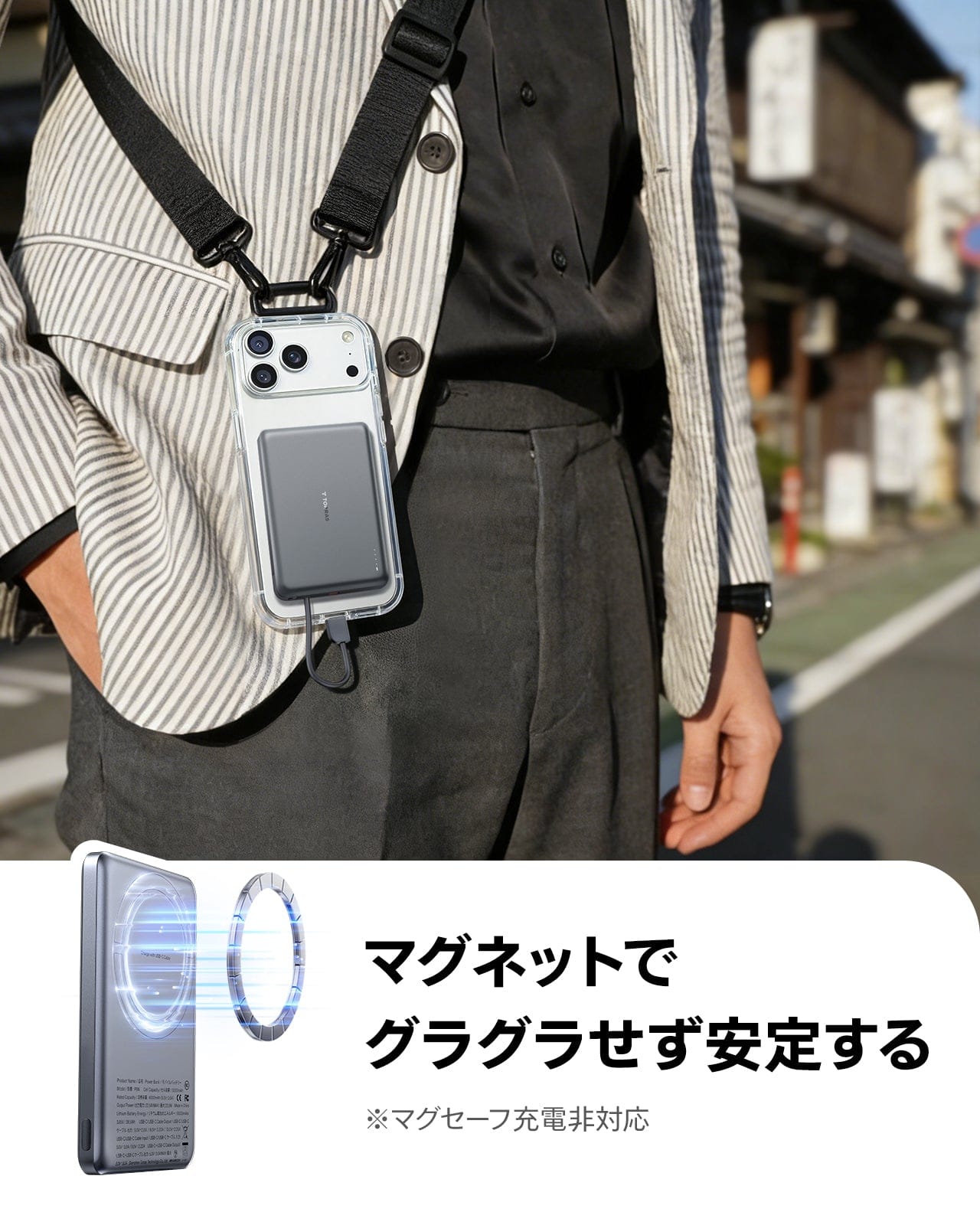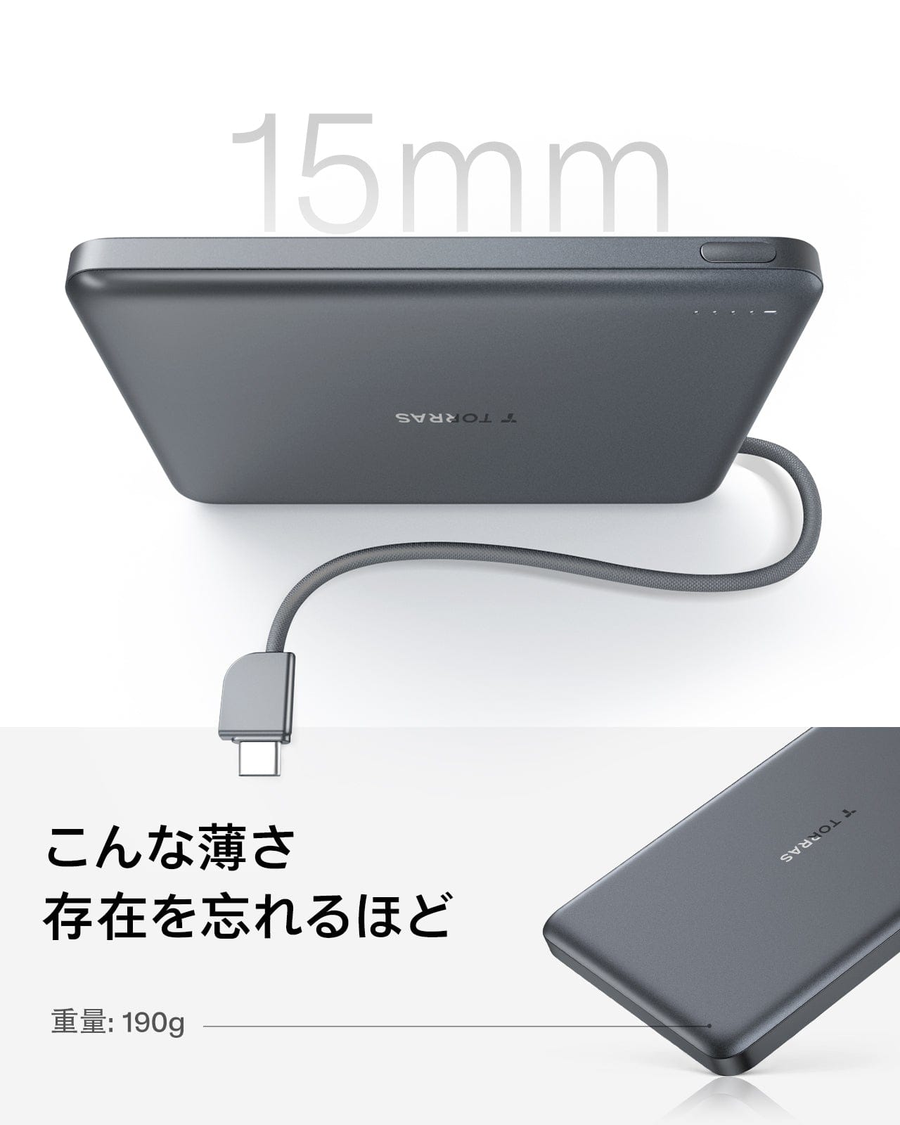 - 持ち運びに便利なスリムデザイン:10,000mAhの容量ながらわずか180gの軽量設計。ケーブルはショルダーストラップとしても使え、さらに便利です。