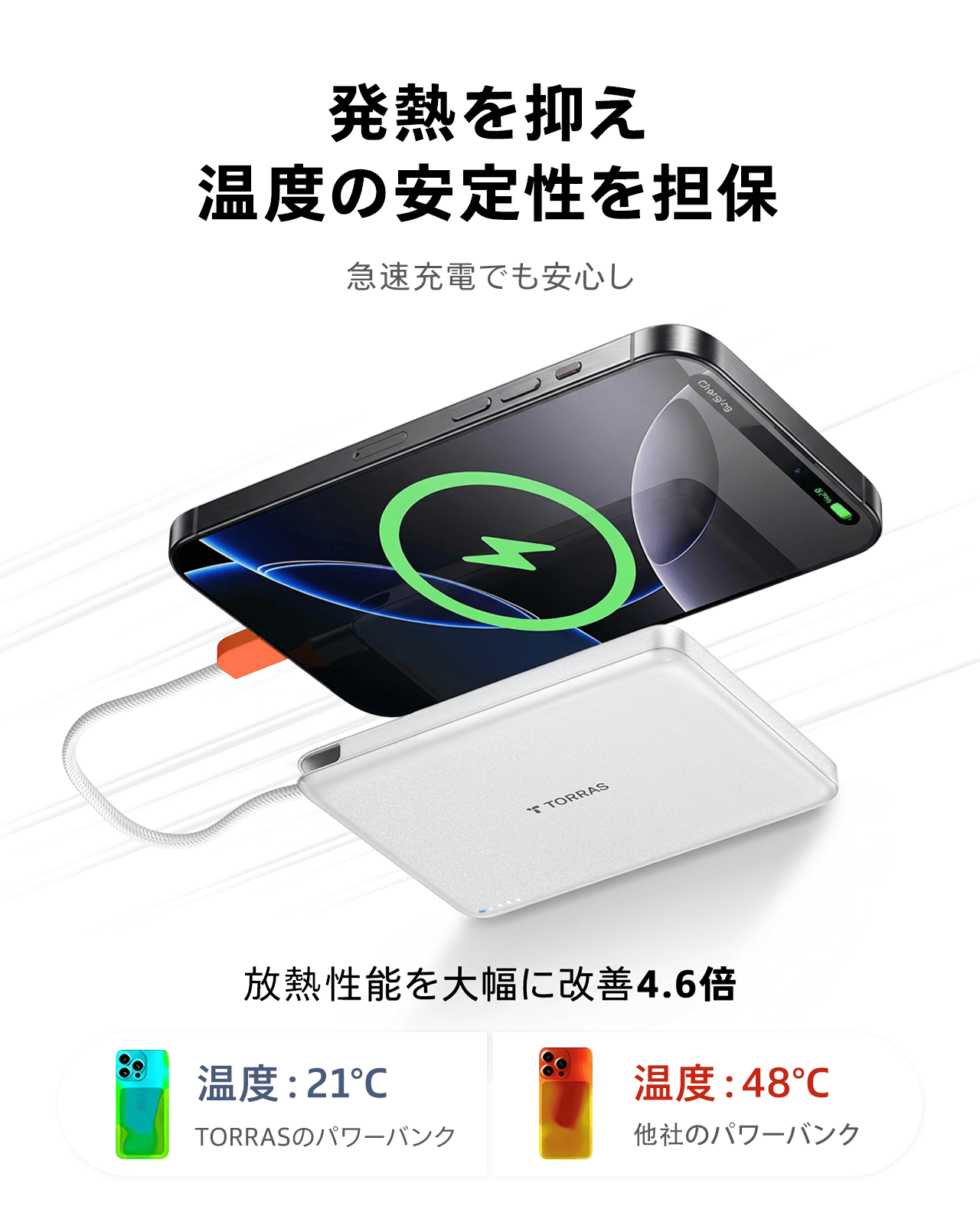 - 一体型ケーブルで持ち運びやすく、有線接続で高速かつ安定した充電を実現します。マグネット式アタッチメントはデバイスを固定するためのもので、充電用ではありません。充電には付属のケーブルをご使用ください。