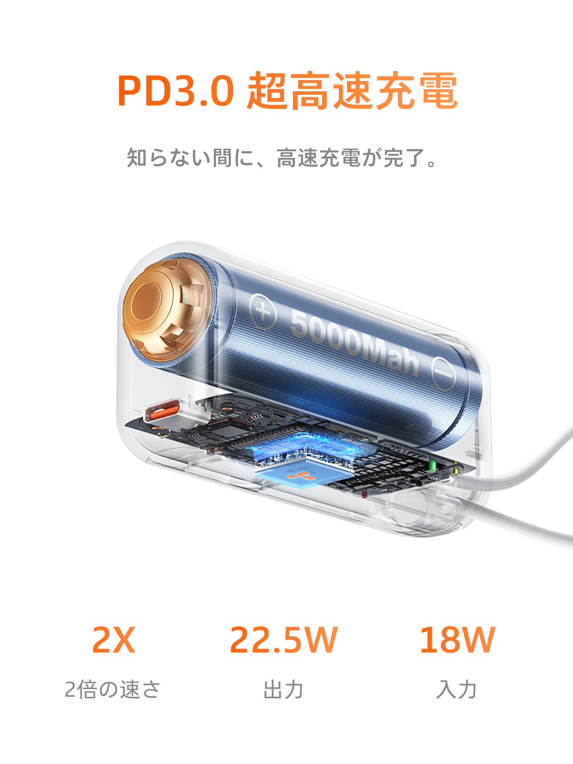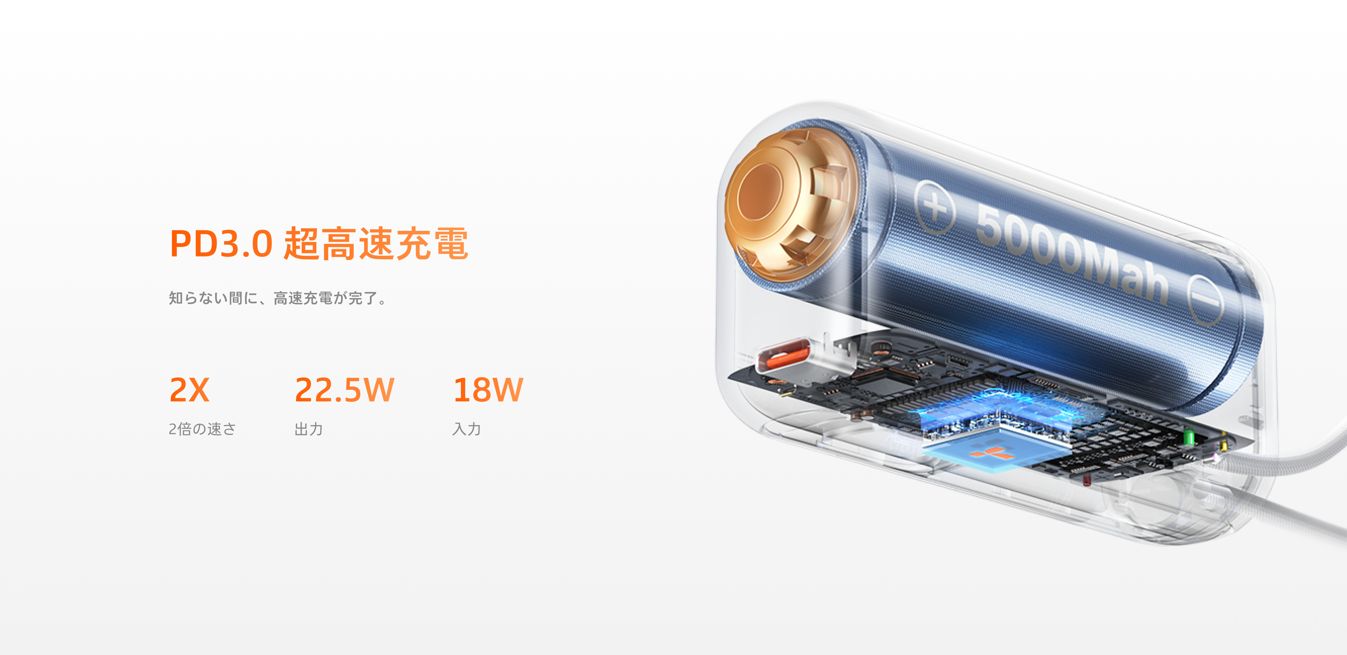- パススルー機能で、スマホ優先充電後、モバイルバッテリーの充電に自動切替。充電中も安心です。