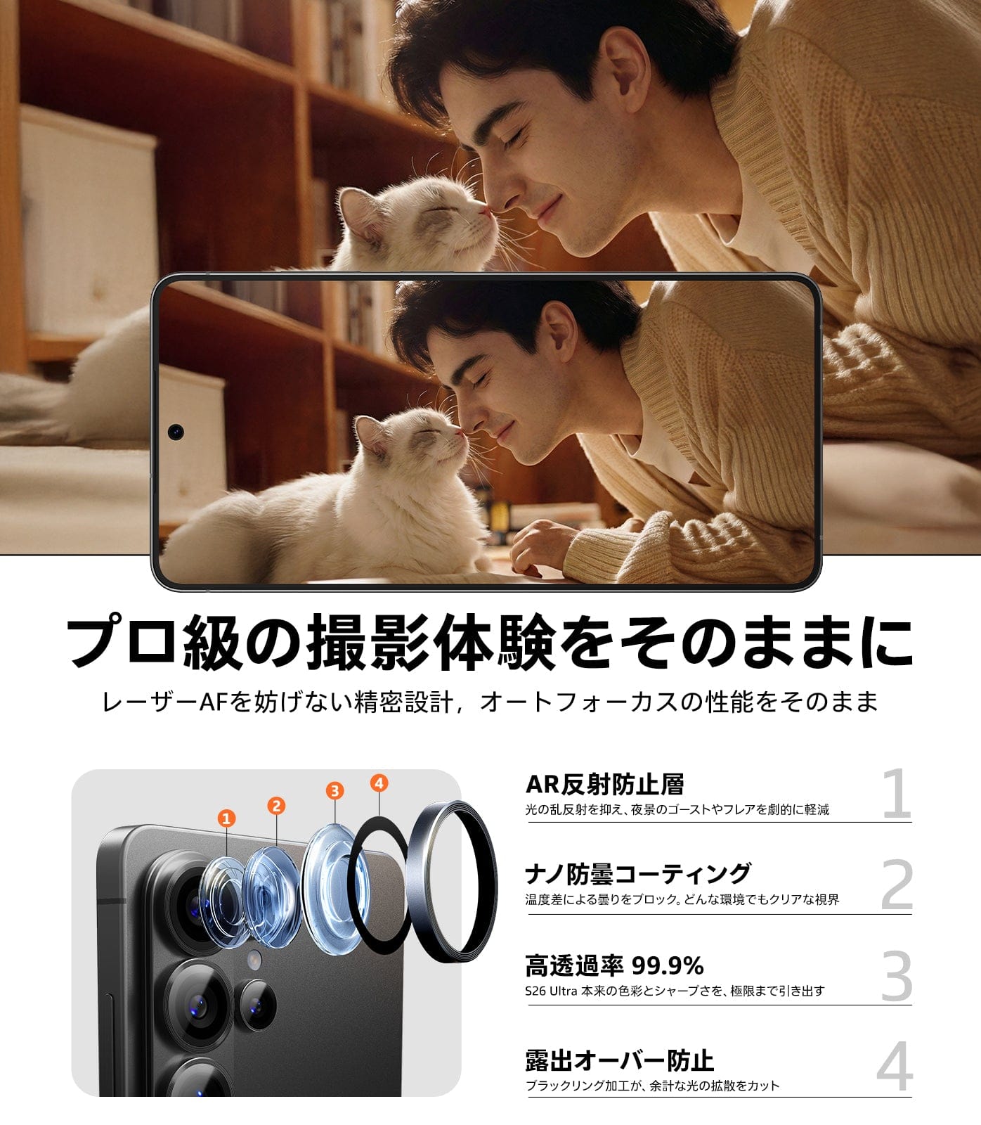 【Zerolens — つけていることを忘れる守り(Zerolens: Invisible Protection)】TORRAS Zerolensは、「無」という美学を基準に設計されたレンズ保護ライン。 装着してもGalaxy S26 Ultra本来の美しさや造形を損なわず、光と影の表現に一切干渉しない。 ――しかし、いざという瞬間には、確かにそこにある。ひたむきに写真と向き合うあなたへ。 Zerolensは「情熱・極致・自由」の精神をその身に宿し、 被写体と同じように、あなたの表現を、ありのままに尊重します。