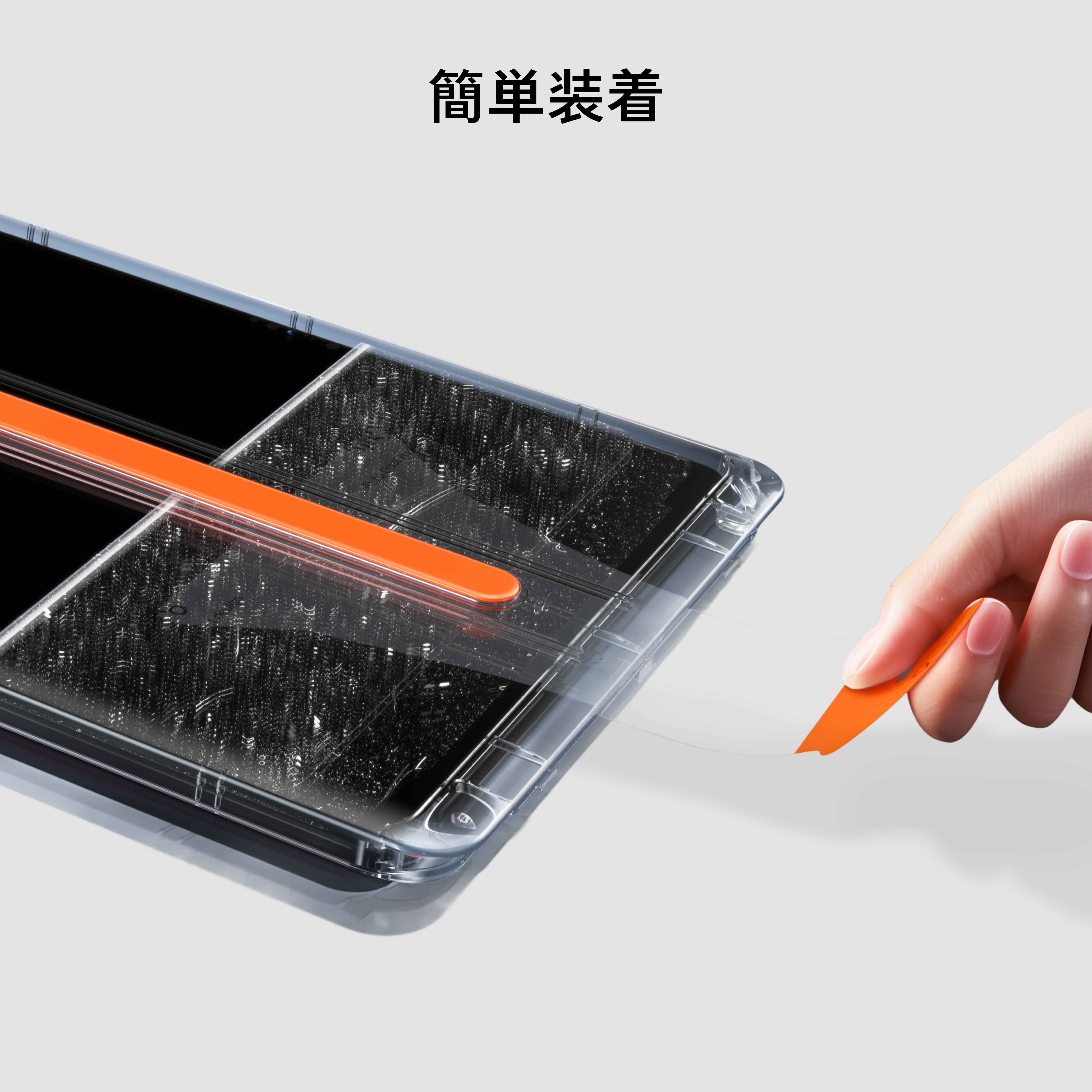 軽く引くだけで自動的に空気が排出されます。内蔵の静電気埃除去機能で、素早く装着·埃なし、気泡なし、専門テストで99%以上の成功率を実証。